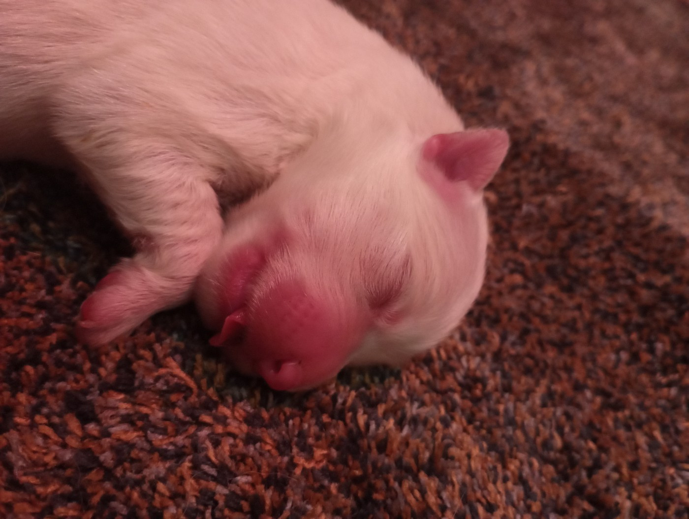 Chiot M1 ee-red. Poids de naissance: 256g Ce chiot présente une couleur très claire de ee-red, il sera donc testé avant d'être mis à la réservation. Les tests seront fait à sa 3 ème ou 4 ème semaine de vie.